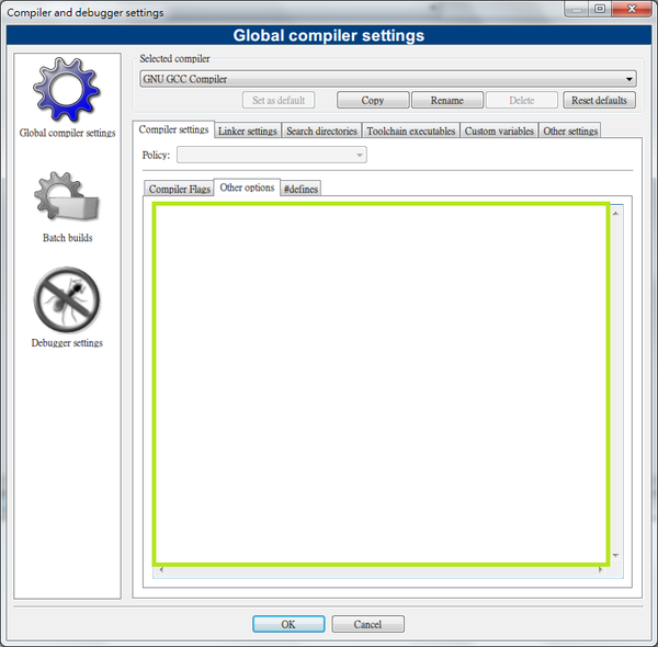 Settings->Compiler and debugger...->Other Options