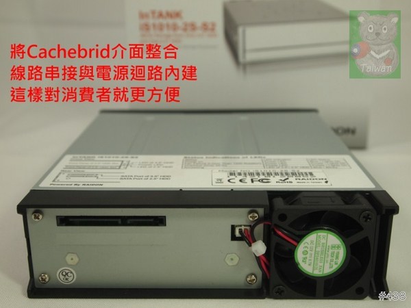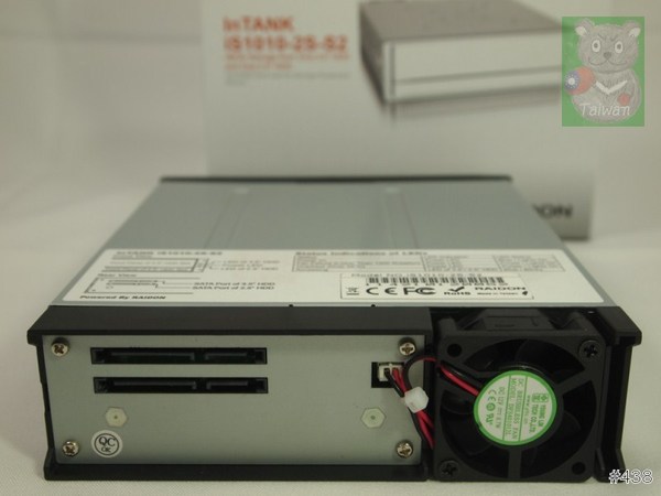 這是iS1010的後方、就像剛剛馬克擺在外面的硬碟一樣,兩個SATA介面是獨立存在的、所以利用iS1010這樣的特性以及SATA介面的HotSwap功能,使用者可以像是以前的「硬碟抽取盒」一樣的使用方式,只要先將RAIDON InTANK iS1010-2S-S2內接式的雙硬碟設備安裝在電腦上,然後就可以依需要抽換3.5"硬碟或是2.5"硬碟了,如果供電環境與條件好一點的主機還可以像伺服器主機一樣熱抽換硬碟、隨插即用、哇!iS1010還真的是蠻人性化與符合資料備份需求或是資料移動與交換需求的使用者使用。