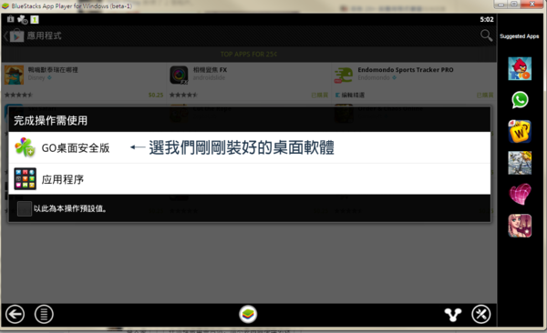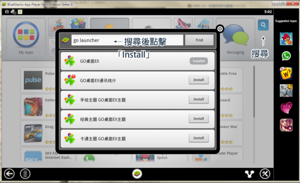 ▲ 首先我們要先跳脫 BlueStacks 的原始介面,不然我們無法找到「GooglePlay」來付費,先搜尋「go laucher」(或是任何桌面軟體都可以)