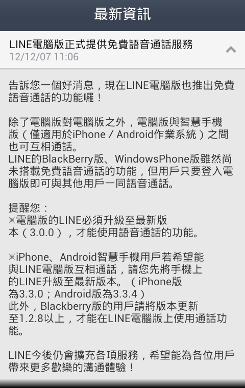▲ Line 開始提供電腦版通話服務,WindowsPhone 與黑莓版本尚未支援。