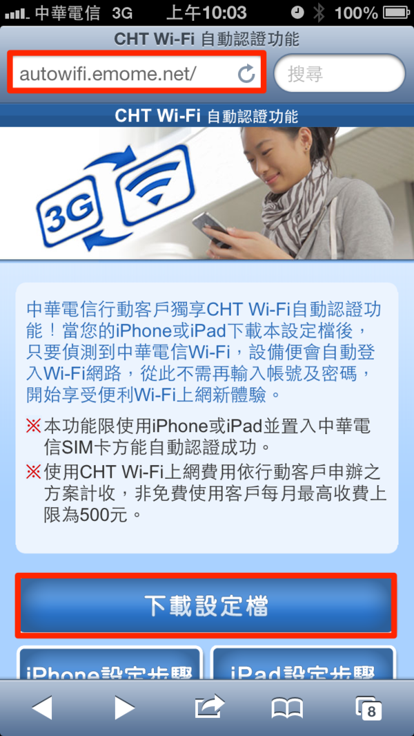 1. 使用 iPhone 進入 http://autowifi.emome.net ,並且點擊「下載設定檔」。