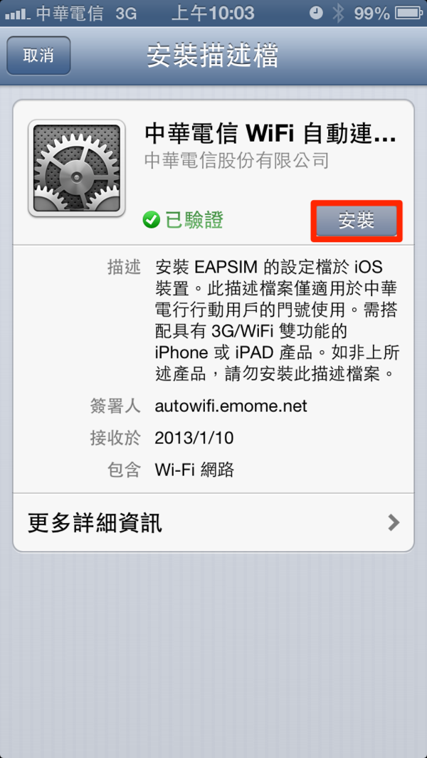 不過...沒有裝到中華電信 Wi-Fi 自動連接的設定檔的朋友,不用等到 1/15 探長這邊有將設定檔抽出,所以可以直接用 iPhone 的 Safari 打開以下連結就可以下載並安裝設定檔了: