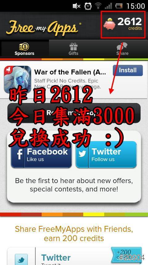 下方有邀請連結,可請朋友幫忙用,本身10幾個朋友幫我下載FREE MY APP 但只成功3次 600點 ==