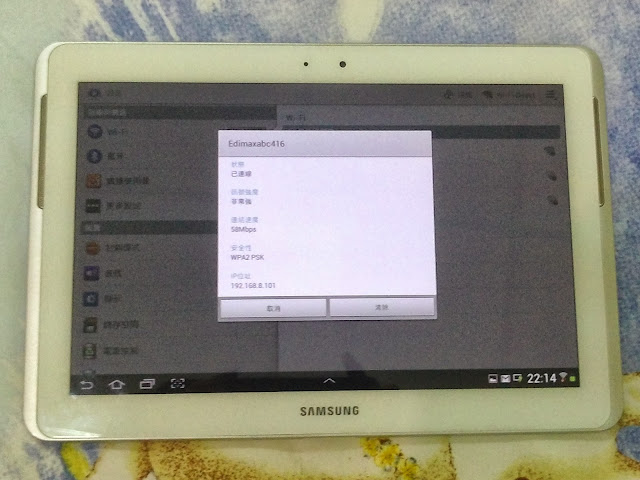 使用三星平板連接的狀況,因為剛剛已經把AP設定完畢,所以這邊直接連線,輸入密碼後就可以連線了。