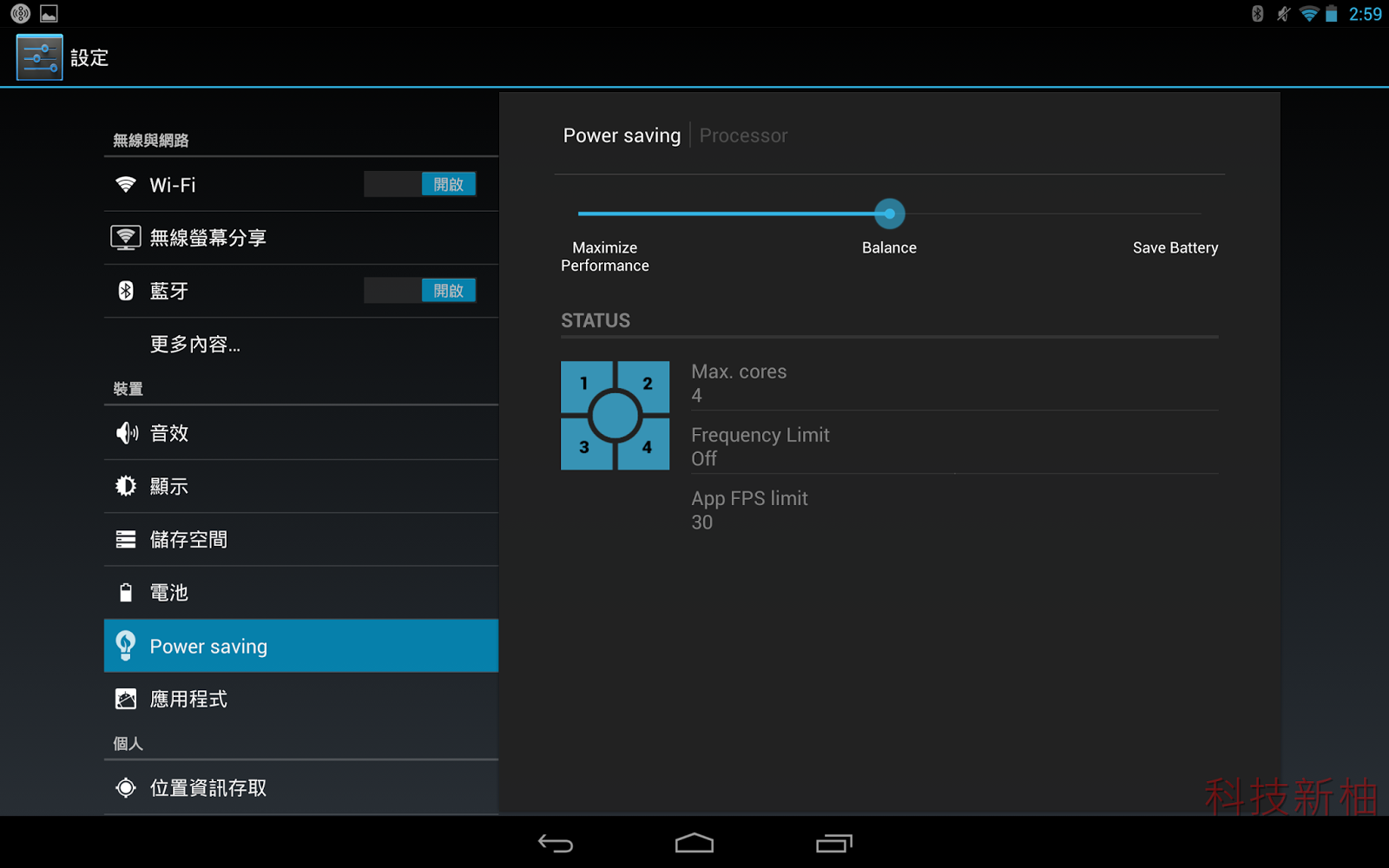 ▲ 最右邊為省電模式,僅使用其中兩顆核心,並且將 FPS 限制在 30 格。