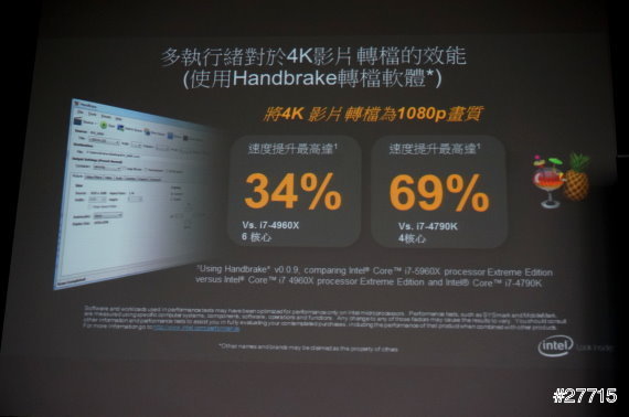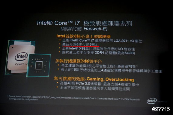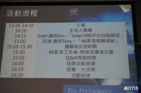 今年6月艾倫有參加「INTEL INSIDE X86 行動裝置大未來的活動」,上次的活動主題是INTEL X86在手機和平板上的發展,這次的活動: INTEL X99平台效能大解密是和大家介紹Haswell-E處理器,這處理器的架構有重大的突破,以往X99晶片組與Core i7系列處理器的客群主要是使用專業軟體,效能要求高的專業工作者,這些配備隨便都動輒好幾十萬,不是一般消費者可以負擔的,INTEL這次的大突破就是將最新的8核心頂級X99平台的專業效能下放到消費級的桌上型電腦,讓這專業級的效能更加普及化,大家不要被「專業級效能」這幾個字嚇到唷! X99平台效能一流,但價格十分的親民唷!! 還有一個重頭戲,就是INTEL和4K影音的搭配應用,艾倫就來為大家介紹今天的活動。
