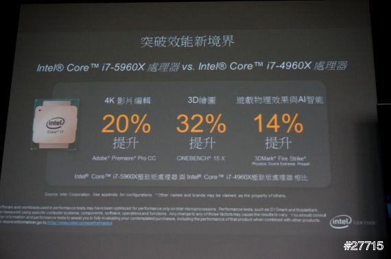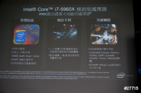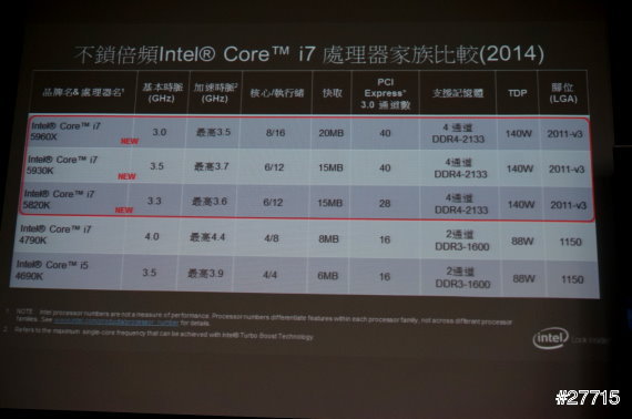 同樣是INTER Core i7處理器但不同的型號卻差異很大,Core i7-5960X八核心處理器大幅提升了4K影片編輯、3D繪圖和遊戲效果的速度。