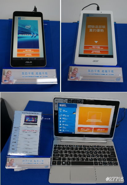 現場展示了一台ACER平板、一台ASUS平板和一台ACER筆電,這三台共同的亮點就是都使用INTEL的處理器。手機的部分可以參考ASUS zenfone系列,同樣也是使用INTEL的處理器。