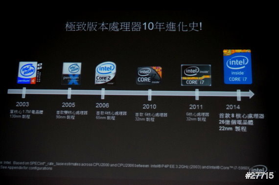 INTEL這10年進化史,從2003年單核心 130nm製程開始,INTEL不停的研發,雙核心、四核心、六核心,一直到今年2014年的八核心處理器22nm製程,這都是INTEL不停歇研發的心血。