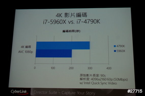 威力導演分別搭配i7-5960X和i7-4790K的編碼時間,5960X縮短了3分之1的時間。