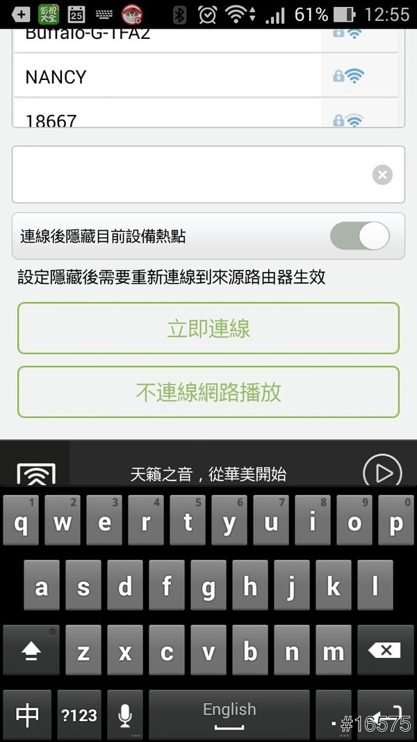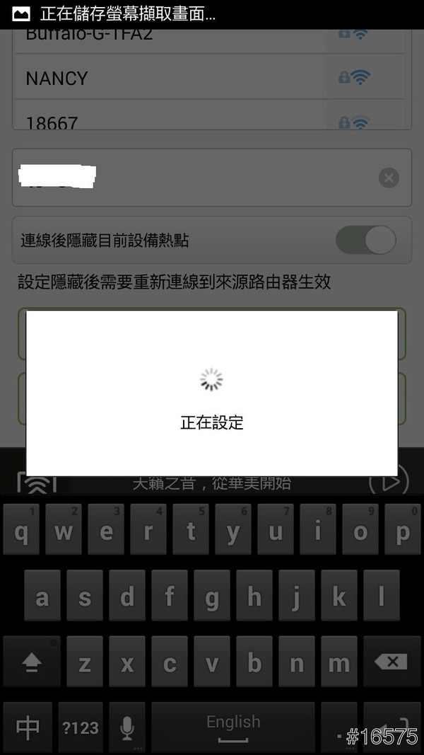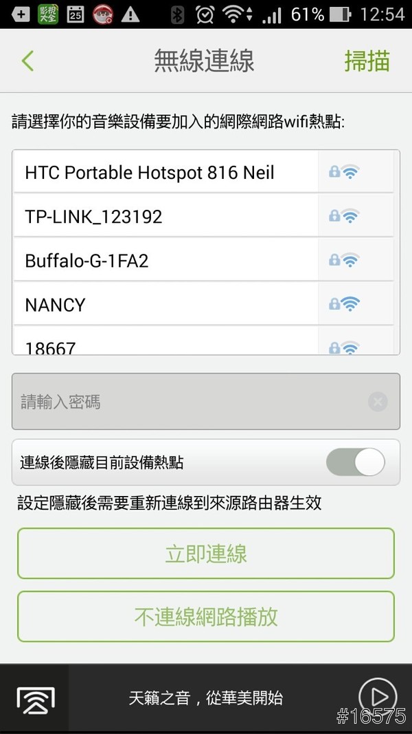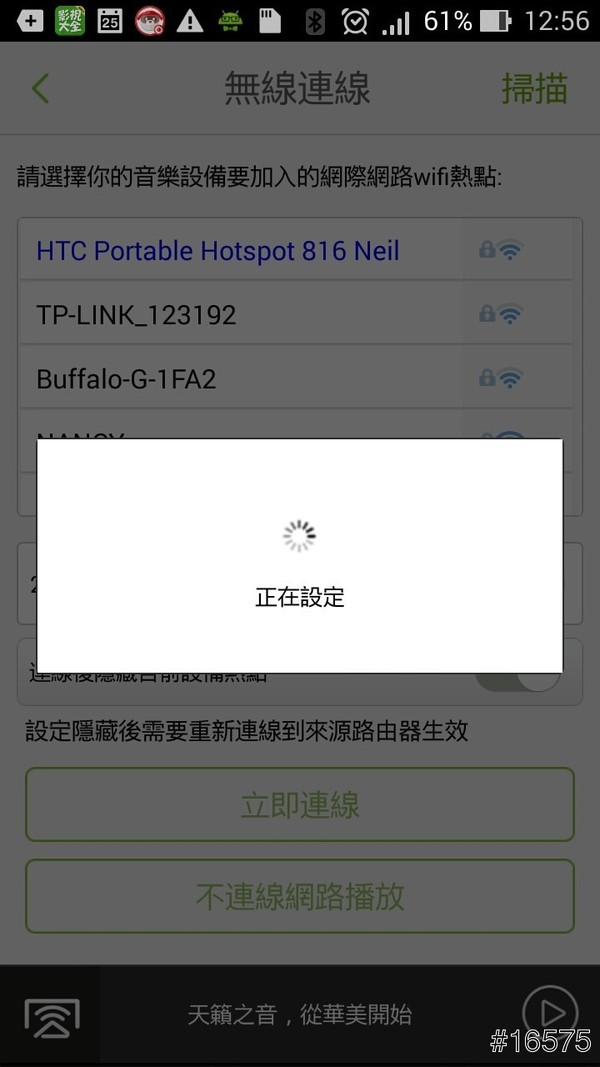 在上一個步驟輸完密碼後選「立即連線」,就會開始設定(指的是由手機搖控設定Hame MR-S1),上方塗白的部分也是因為有我的密碼,所以我塗白了。