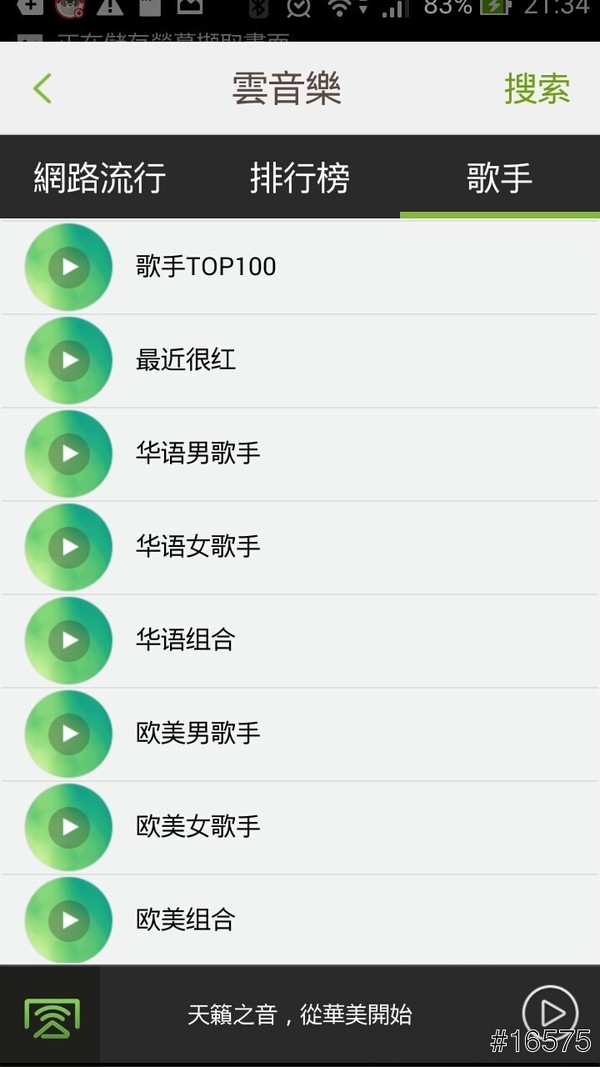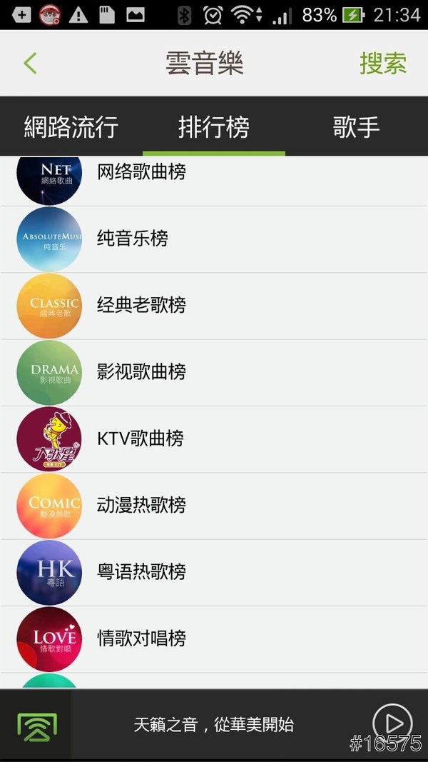 另外,因為有些人喜歡固定聽某些歌手的音手,這裡也有用歌手分類的,如果你想要直接搜尋也可以,在右上角按下搜尋按鈕即可搜尋你所想聽的歌。