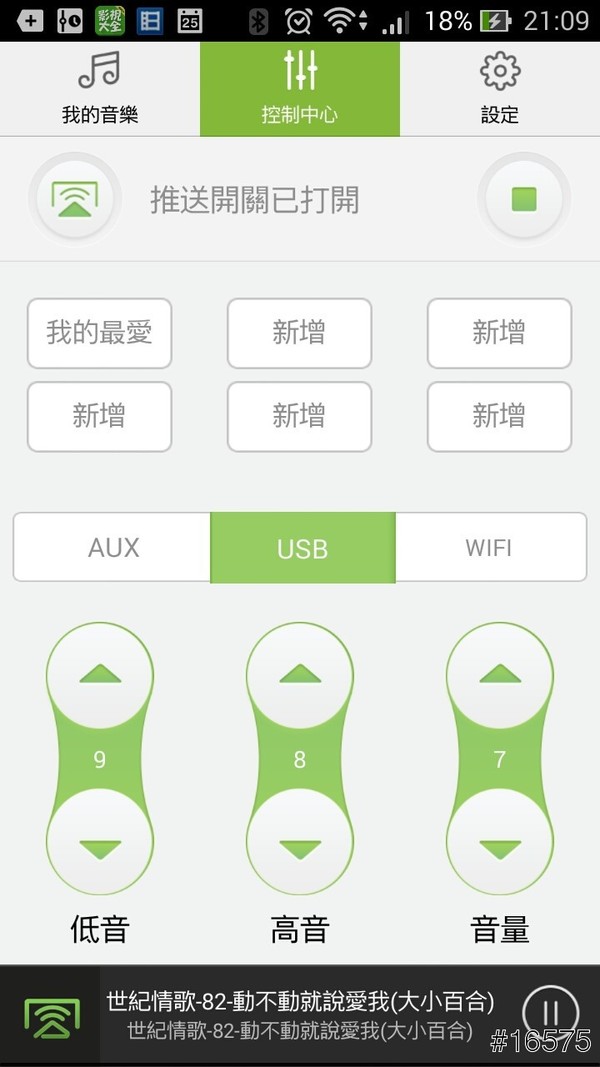 而且你還可以用手機遠端控制Hame MR-S1的USB隨身碟,或者讀卡機內的音樂播放,如圖所示,這 app是華美專屬的,很方便。最下方就是現在正在放的歌,上面還能控制音量、高低音等。