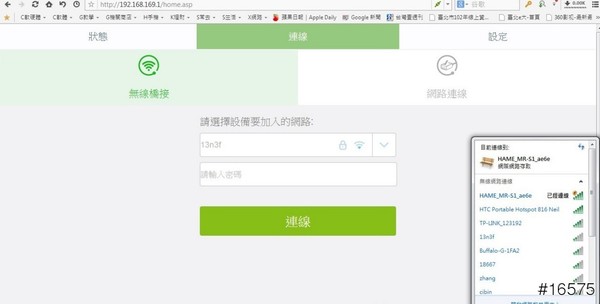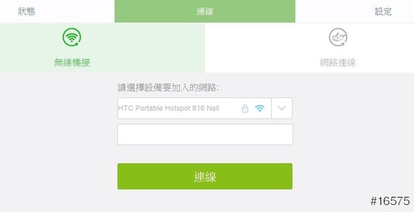 首先選擇無線橋接的頁籤,在請選擇設備要加入的網路裡選擇你要加入的網路,然後在下方輸入密碼,按下「連線」。