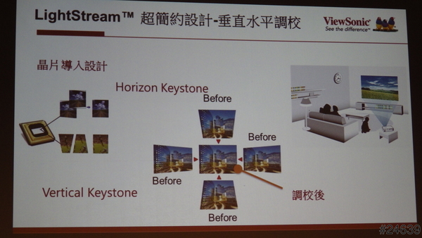 在有些家庭或是會議室中,有時候因為傢俱擺設的關係,所以投影機無法擺在正中央,因此有可能會影響投影出來的效果就是歪歪的。但....ViewSonic卻有辦法可以做到即使投影機是擺斜的,但是投出的影像卻是方方正正~~不會"走鐘"