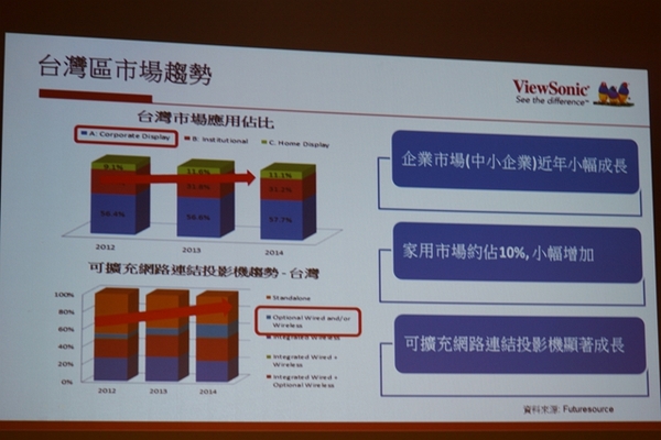 ▼針對台灣市場趨勢分析,企業和家用市場近年來都是呈現小幅成長。但是可擴充網路連結功能的投影機種卻是顯著成長,相信有網路連結功能的投影機將是未來市場的主流。
