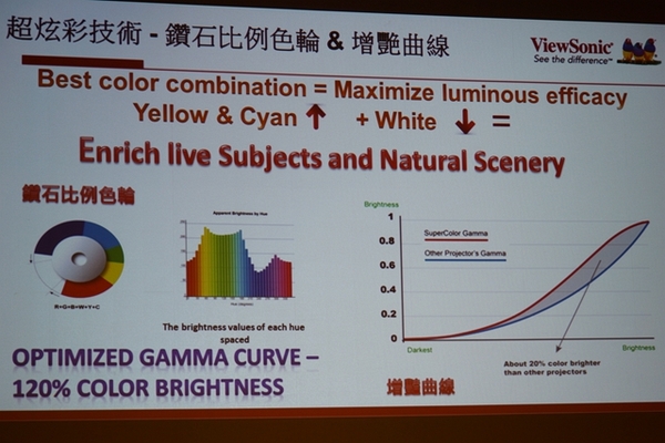 ▼ViewSonic LightStream的超炫彩技術,透過鑽石比例色輪和增艷曲線,增加黃色與青藍色部份,降低白色色彩,而讓色彩更豐富,顏色更逼真。