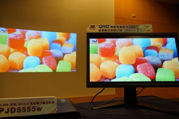 ▼PJD5555W色彩輸出非常精準,投影出的顏色色差可以跟在螢幕上一樣,適合對色差要求高的使用者,像是公司簡報產品等等。