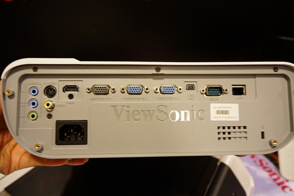 ▼背面,除了常見的輸出端子外,可以見到還有HDMI,另外最重要的是,在最右邊還有RJ-45網路接口。可以看出投影機連網的重要性。