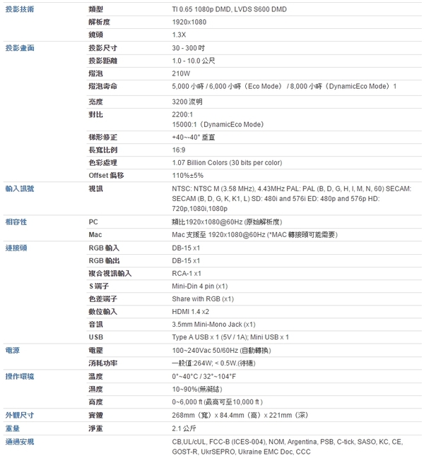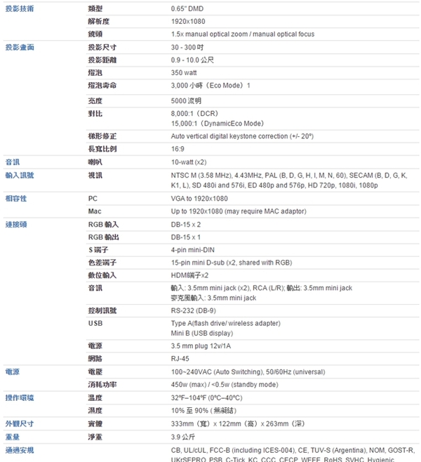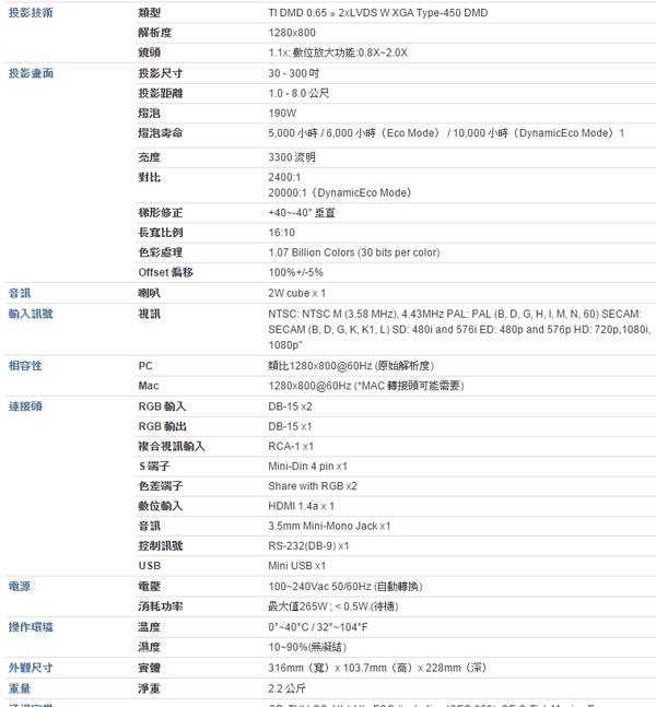 ▼原廠Pro8520HD規格表:
