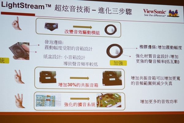 ▼ViewSonic工程師,對LightStream光艦投影機-超炫音技術,進行了三個進化步驟,改變音效驅動模組、增加30%體積的共振音箱與強化的擴音系統等步驟,才能讓LightStream光艦投影機的聲音表現如此美好。