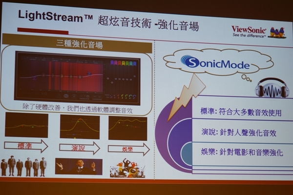 ▼在軟體方面,ViewSonic工程師除了在硬體感善外,也在軟體方面調整音效,提供標準、演說與娛樂三種模式,可以讓使用者針對不同場合需求,進行聲音最佳輸出設定。