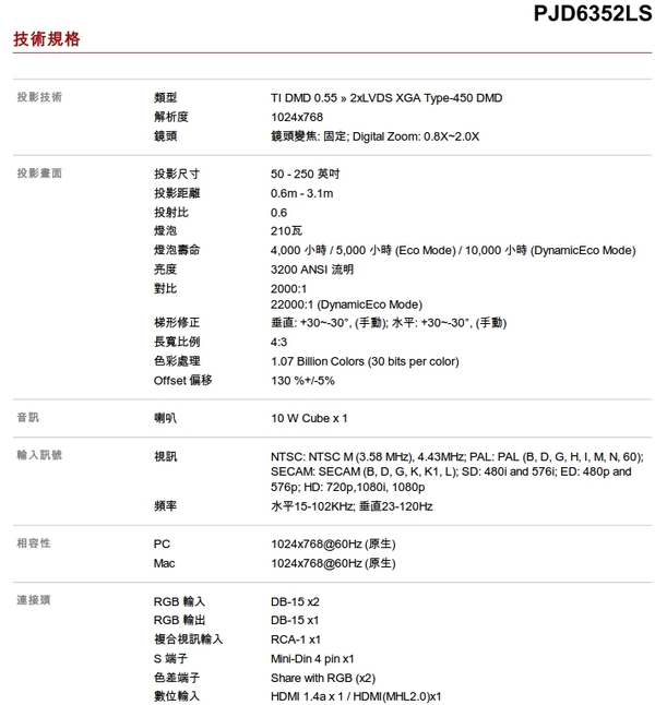 ▼原廠PJD6352LS規格表: