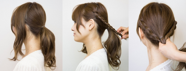 3. 將左右麻花辮跟馬尾紮成一束即可