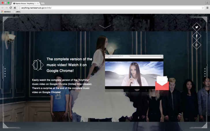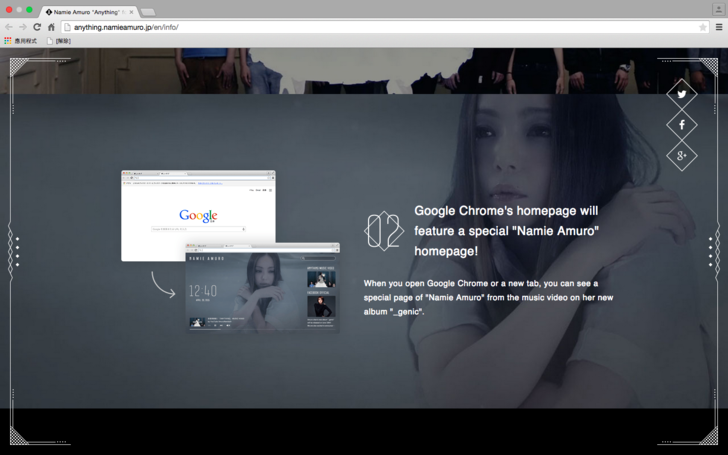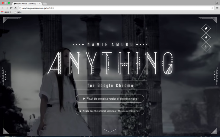 大家應該都認識這位日本超人氣女神安室奈美惠吧?最近發行新音樂作品的她,繼不久前的「Golden Touch」互動式 MV 造成討論熱潮後,在最新推出的 MV 「Anything」中,更是和 Google Chrome 合作推出「連動式」MV,只能說這位天后真的無極限啊 ✪ω✪