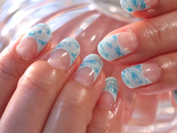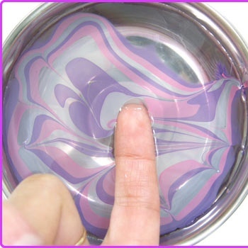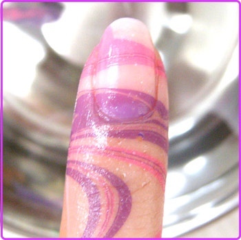 接著,慢慢把指甲靠近水面,讓指甲沾附到水面的指彩
