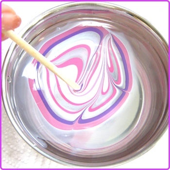 不要急著將手指離開水面,用牙籤把水面上還懸浮著的油彩給破壞掉