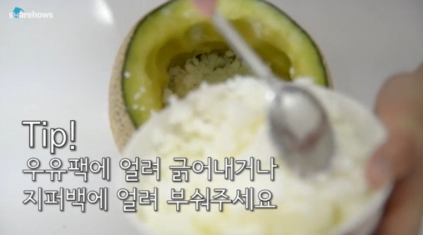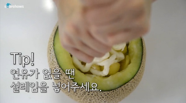 把牛奶剉冰倒進挖空的哈密瓜冰裡