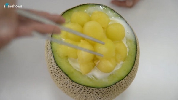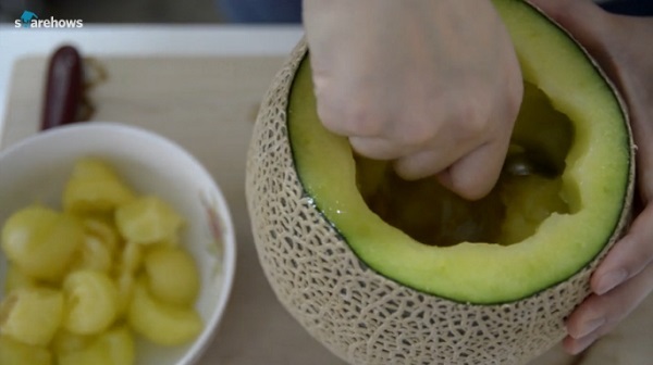 首先用計量的湯匙把哈密瓜的肉挖出來,記得一定要挖的一球一球的