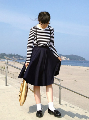 橫條紋白底襪跟淺棕色樂福鞋搭配