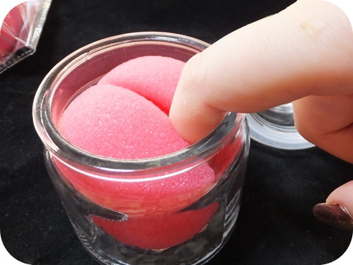5.在小瓶子裡放進一塊海綿然後倒入去光水,