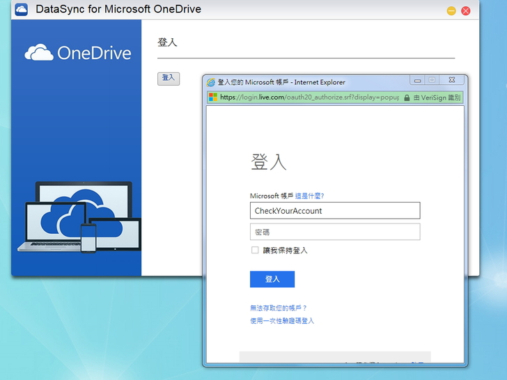 ▲我們就拿Microsoft 中的One Drive來試試看,當然一開始一定要與帳號作連結,帳密不可少