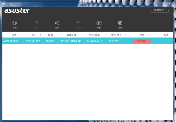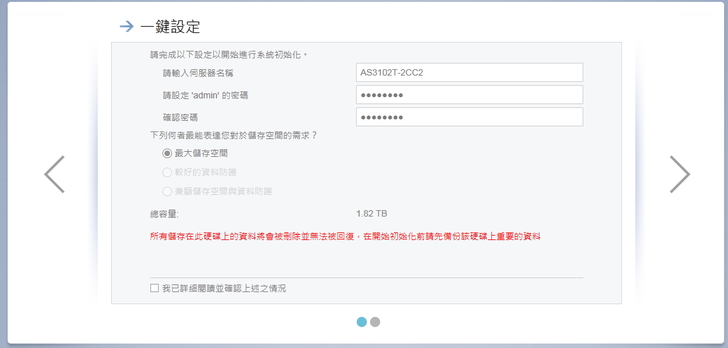 ▲現在每家NAS廠都會有自已在PC端的主控介面,華芸也不例外,它叫作control center,可以看到已經找㺫AS3102T,HHD是新的,所以要開始設定過程。