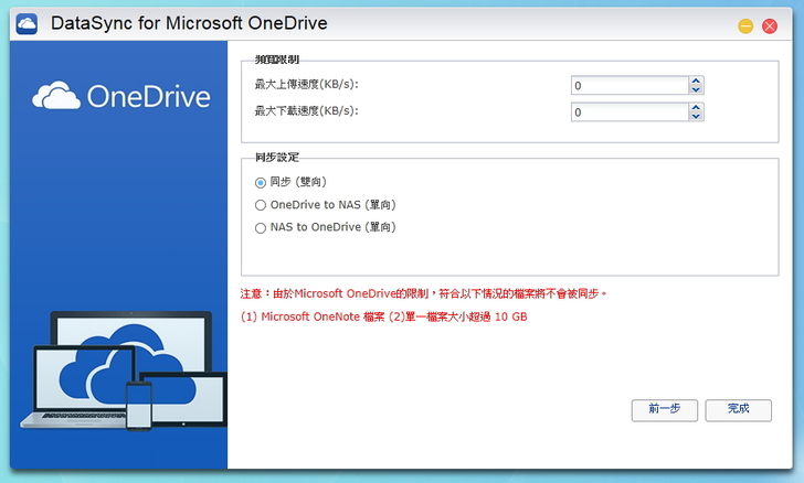 ▲最後選擇要同步的方式就大功告成了,當然每個公有雲都有自已的限制,One Drive則是10G以上,與筆記軟體不能備份。每個公有雲備份的方式都差不多,可每個都備份,有備無患。