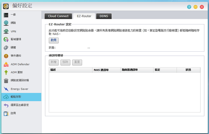 ▲另外,NAS很多服務是通過特有的連通埠來溝通,若這些通道沒開啟,服務就無法使用,而華芸的ADM有這個EZ-Router,只有一鍵,它就會幫你設定好
