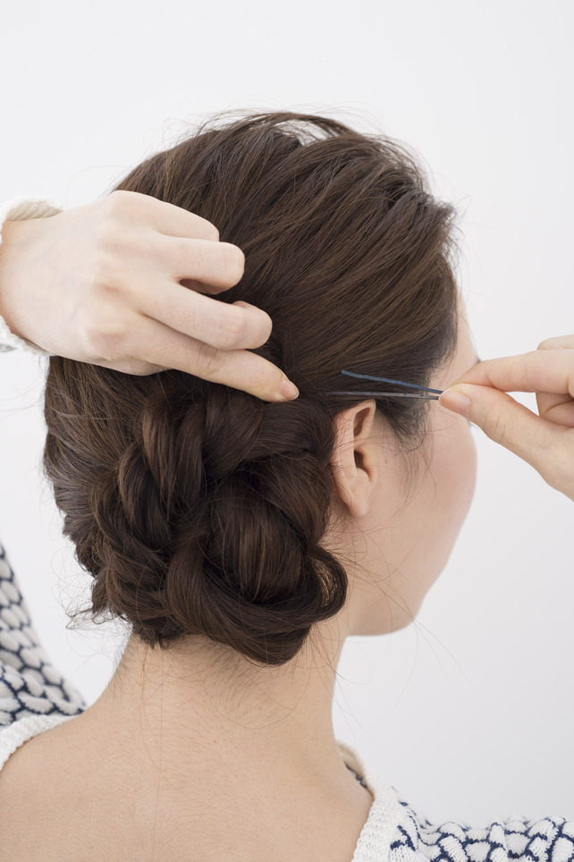 ④繞好之後在耳後的位置捲成丸子頭,用夾子固定,再加上喜歡的髮式,完成!