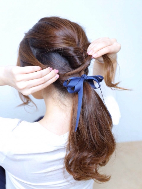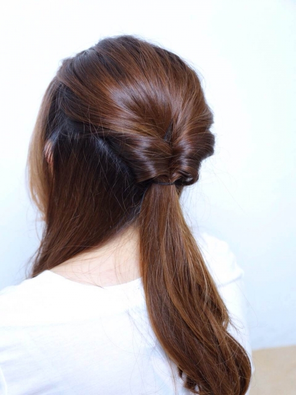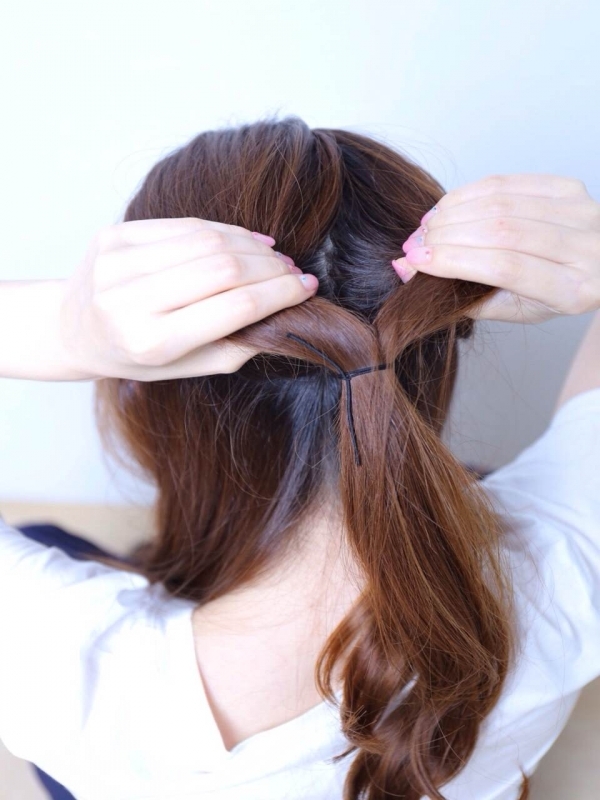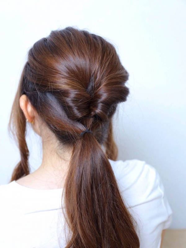 ③下層的頭髮留住兩側不綁,中間綁一個馬尾,一樣挖洞反轉過去。