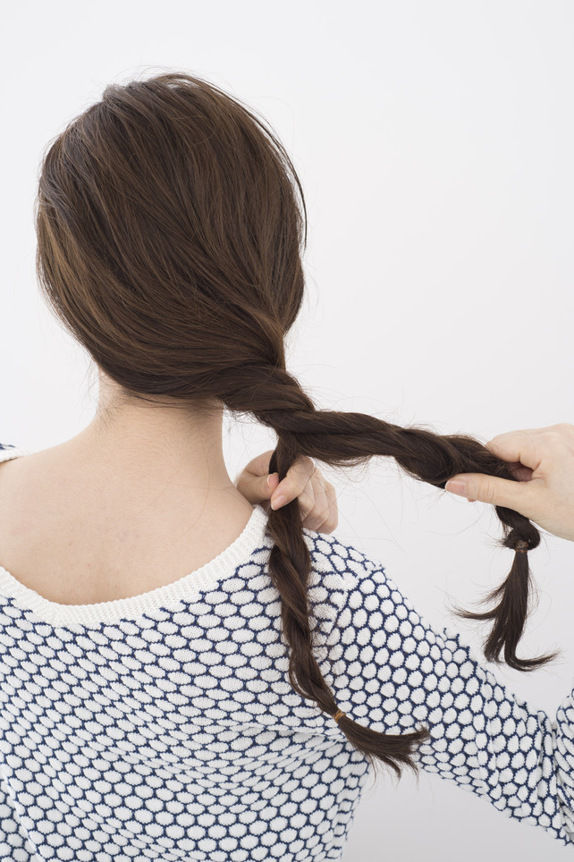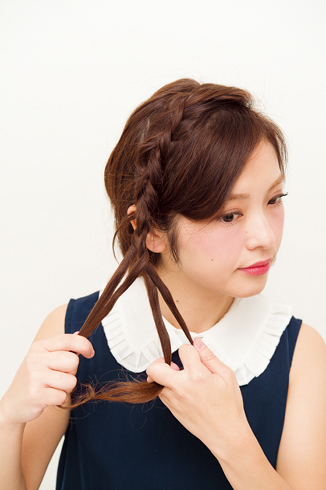 ②剩下沒編的頭髮像綁公主頭一樣抓一束起來,扭轉成髮束,跟綁好的三股辮繞在一起。
