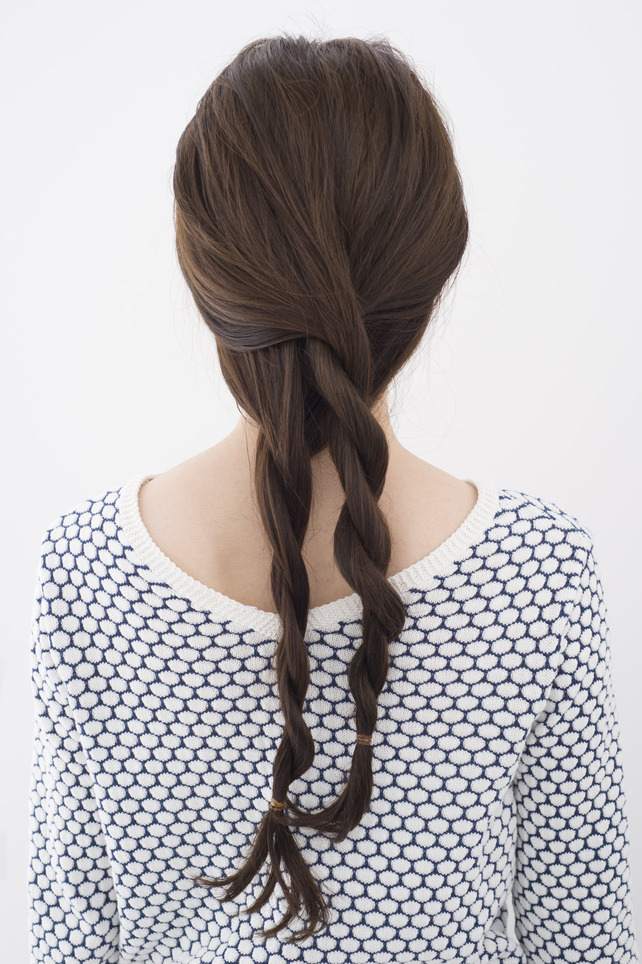 ②扭轉兩側剩下的頭髮,用夾子固定在中間辮子綁起來的地方,完成!