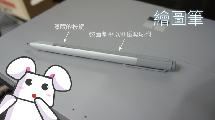 跟SP3的繪圖筆相比,最重要的部分就是增加了一個削平的平面,在磁吸於SP4上時會更穩定,基本上吸上去以後真的除非刻意去拔,不然不太會因為搖晃而掉落,不過比較可惜的是側邊原先有兩個按鍵,這次就改為一個按鍵了,按鍵是隱藏在平面那端上的,按感稍微有一點點硬,需要一點時間習慣