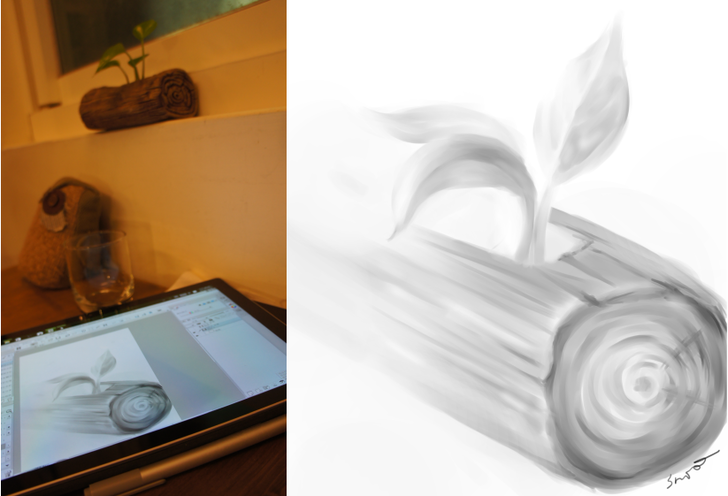 畫完了纏繞圖,看到咖啡店老闆娘種的小盆栽,順手作了素描,這次用水彩筆刷,從頭到尾都使用純黑色來塗,只利用感壓跟重疊來塗出深淺,這時候的繪圖筆感壓就很重要,如果感壓不夠,從淺到深會跳非常快,變化比較沒辦法做出那麼多,感壓高的就可以從很淺打到很深