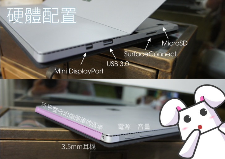 右方則是各式連接埠,USB 3.0、Mini DisplayPort、以及SurfaceConnect特殊的磁吸頭,充電就使用此接頭,磁吸頭不分正反,所以接上電源以後還是可以用各種角度使用SP4,且之後會有其他周邊,可以使用這個接孔擴充更多連接埠,最後還有藏在腳架後方的MicroSD讀卡機
