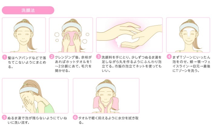 正確的洗臉方法是:先用熱毛巾敷臉1~2分鐘,洗面乳加水搓出泡泡後,依序從臉頰、下巴、臉的周圍、眼睛附近、最後是T字部位來搓洗,溫水沖乾淨後用毛巾輕拍去除水分