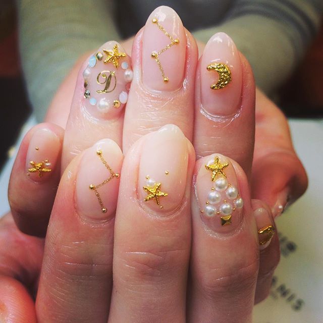 淡粉色的指甲油當作背景,閃耀的星星就以金色來表現,乍看之下以為是素甲但其實很華麗!