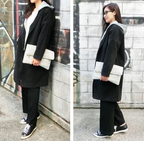 挑戰上身和下身穿全白來對比黑色長版外套,看起來可能會較成熟