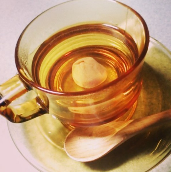 ②等到它表面顏色變深時,就將酸梅拿起來放入溫熱的白開水中,待梅子的氣味入於白開水即可飲用